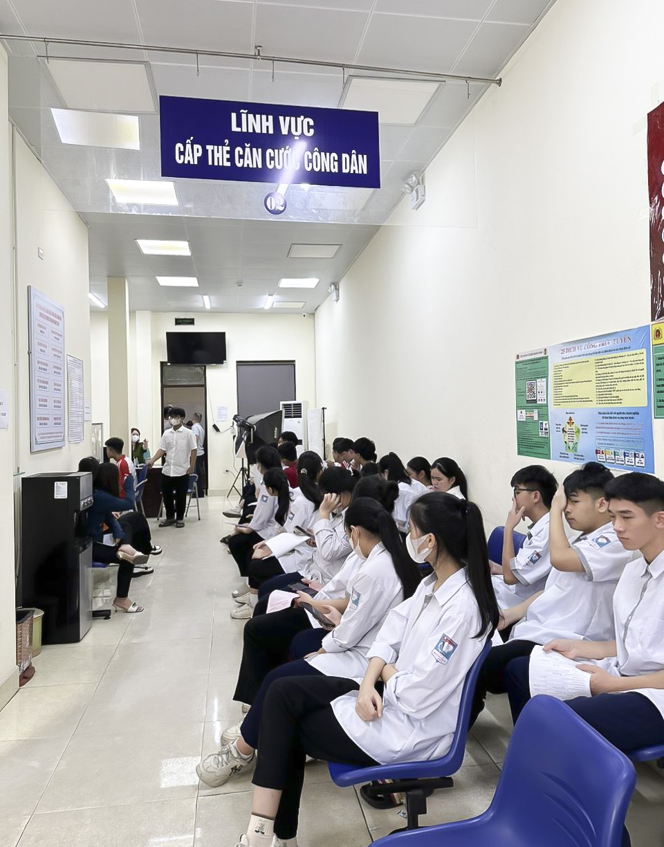 Các em học sinh chờ đến lượt làm thủ tục cấp thẻ CCCD tại Trung tâm HCC thành phố.