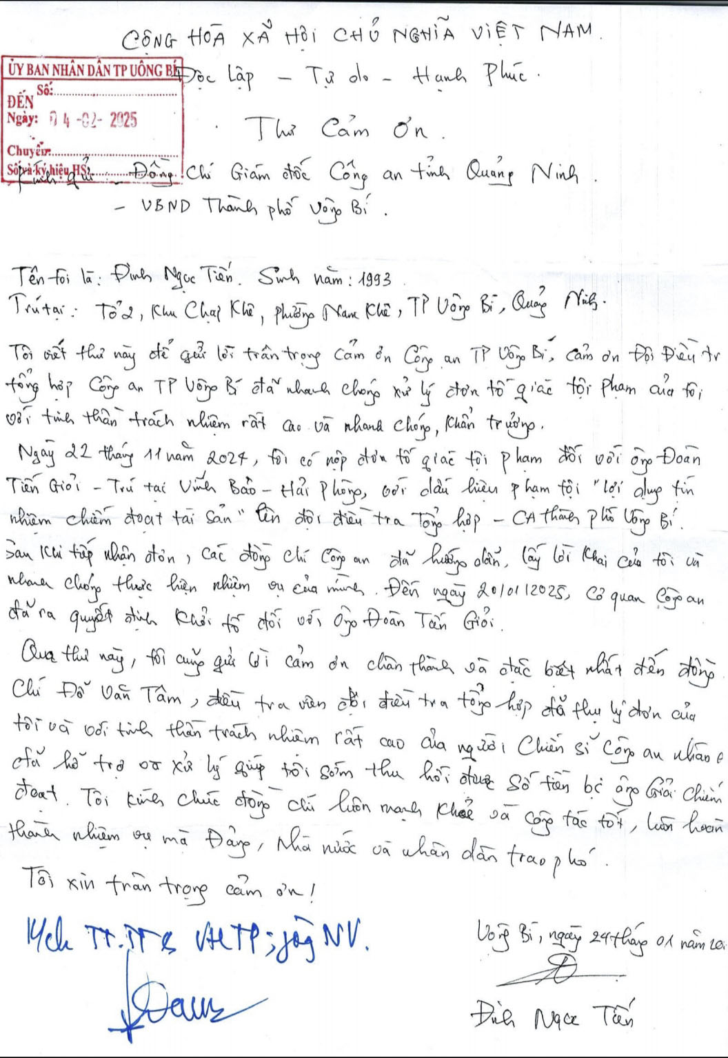 Cuối thư, anh Tiến gửi lời cảm ơn chân thành đến các điều tra viên Đội Điều tra Tổng hợp - Công an TP Uông Bí, đặc biệt là Điều tra viên Đỗ Văn Tâm, người đã thể hiện tinh thần trách nhiệm cao và quyết liệt trong công tác xử lý tội phạm. Nhờ vậy, số tiền bị chiếm đoạt đã được thu hồi và trả lại cho người bị hại.