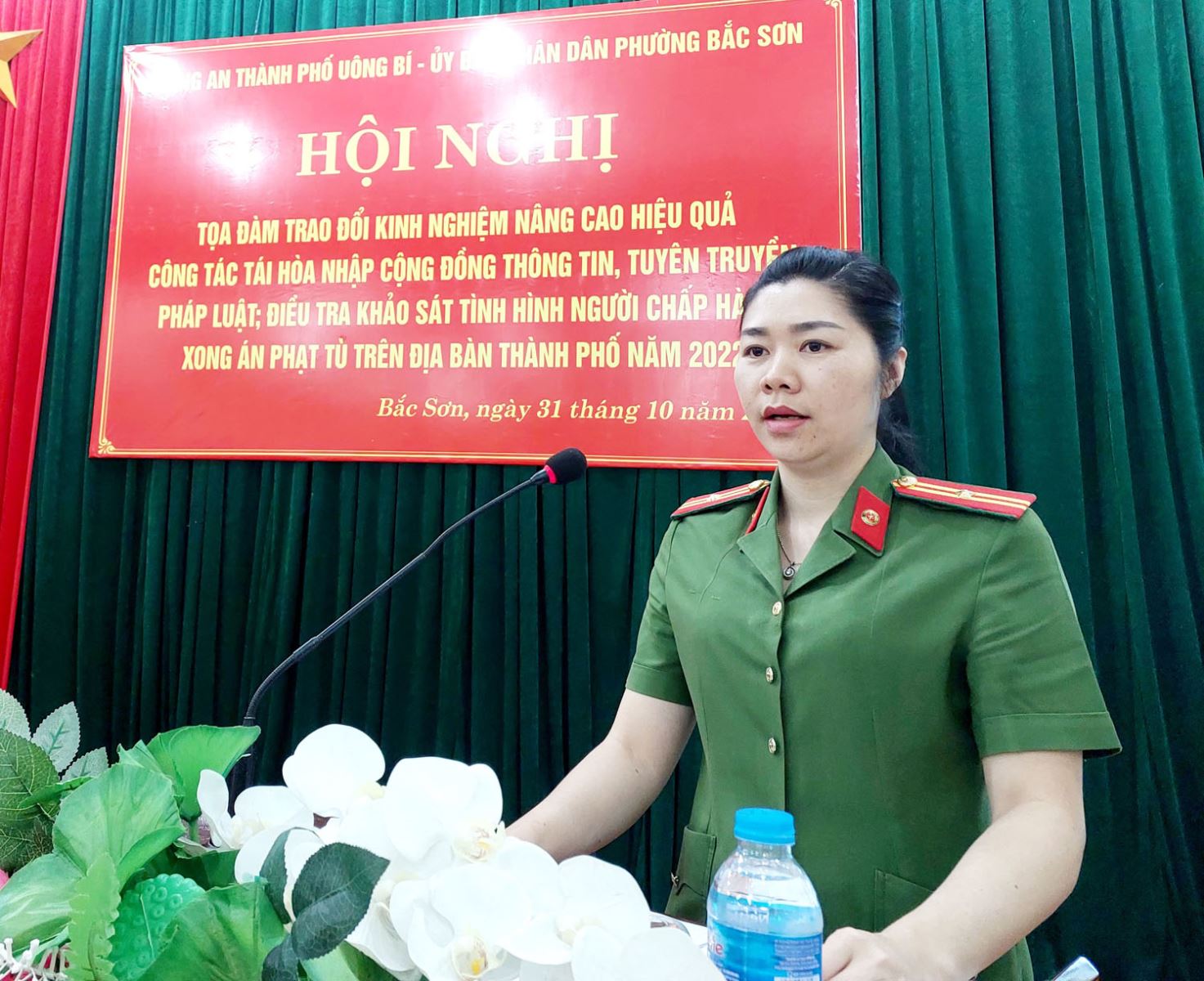 Thiếu tá Nguyễn Thị Thu Giang - Phó đội trưởng Đội Thi hành án hình sự và hỗ trợ tư pháp, Công an thành phố phát biểu tại hội nghị.