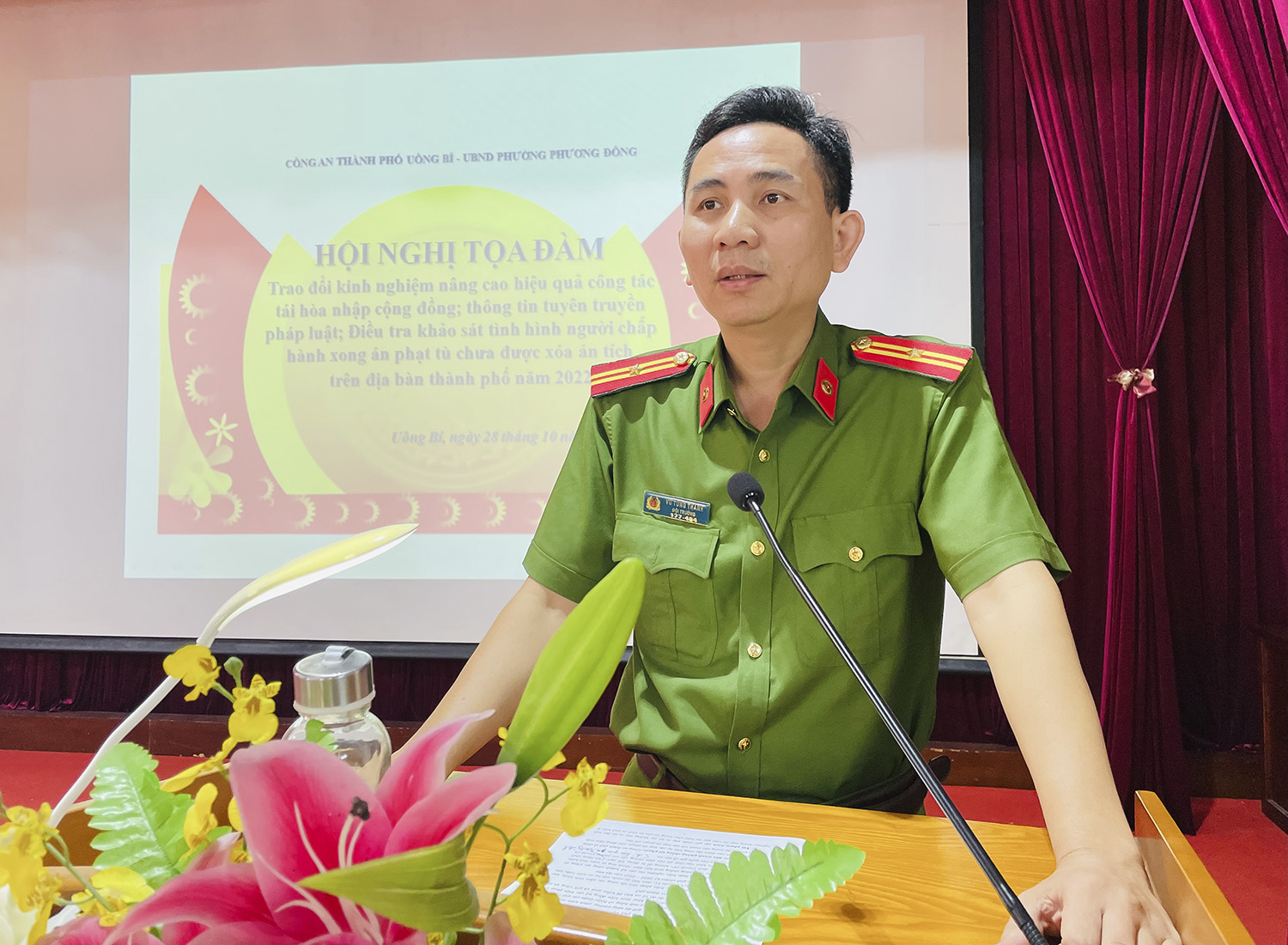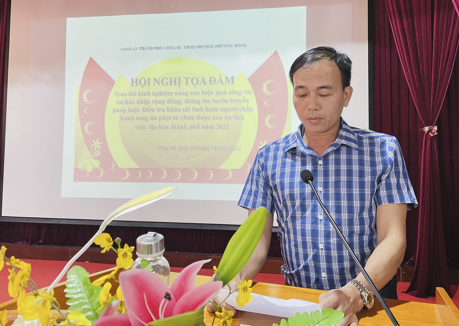 Ngày 28/10, Công an TP Uông Bí phối hợp với UBND phường Phương Đông tổ chức tọa đàm trao đổi kinh nghiệm nâng cao hiệu quả công tác tái hòa nhập cộng đồng; thông tin, tuyên truyền pháp luật; điều tra, khảo sát tình hình người chấp hành xong án phạt tù chưa được xóa án tích trên địa bàn thành phố năm 2022. Tham dự có Thiếu tá Vũ Tùng Thanh, Đội trưởng Đội thi hành án hình sự và hỗ trợ tư pháp, Công an thành phố; lãnh đạo phường Phương Đông; đại diện các khu dân cư; các trường hợp người lầm lỗi tái hòa nhập cộng đồng trên địa bàn phường.