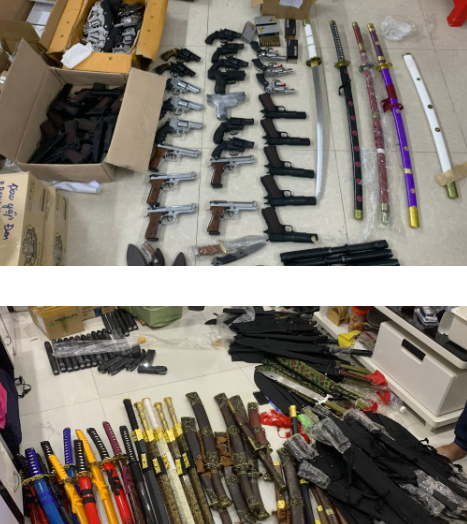 Qua khám xét, lực lượng công an thu giữ gần 150 khẩu súng, 250 viên đạn các loại, hơn 4.000 dao, kiếm và hàng trăm công cụ hỗ trợ khác.