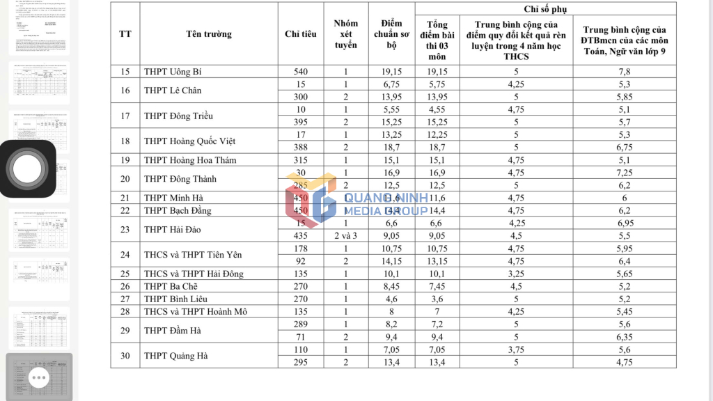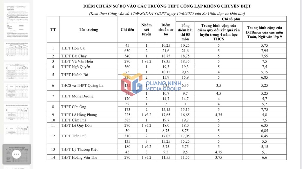 Căn cứ vào dữ liệu đăng ký dự tuyển, kết quả điểm bài thi của thí sinh, chỉ tiêu tuyển sinh và các quy định về công tác tuyển sinh, Sở Giáo dục và Đào tạo (GDĐT) Quảng Ninh công bố điểm chuẩn sơ bộ và thống kê số lượng thí sinh trúng tuyển của các trường THPT công lập tuyển sinh bằng phương thức thi tuyển.