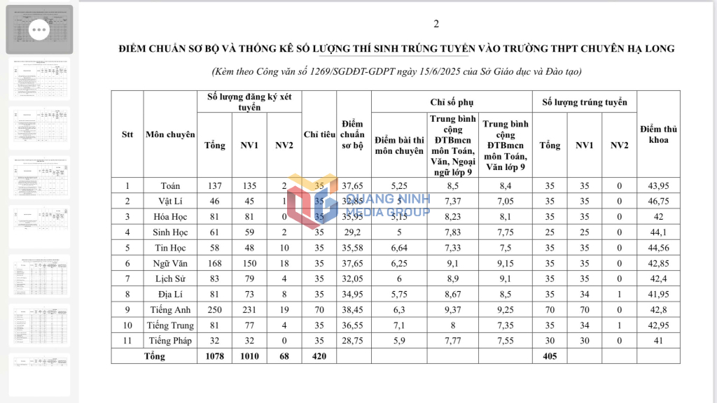 Điểm chuẩn sơ bộ vào Trường THPT Chuyên Hạ Long năm học 2025-2026.