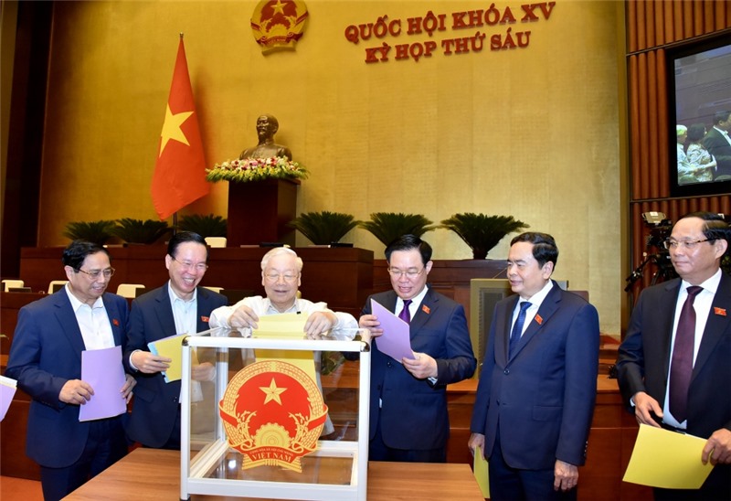 Tổng Bí thư Nguyễn Phú Trọng và các đại biểu Quốc hội bỏ phiếu lấy tín nhiệm đối với 44 chức danh tại Kỳ họp thứ 6.