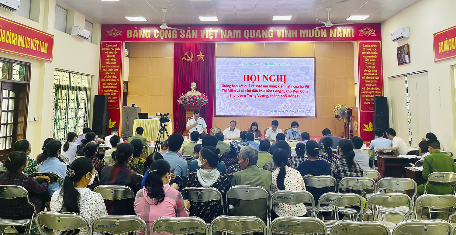 Sau khi nghe báo cáo kết quả rà soát nội dung kiến nghị của bà Vũ Thị Miên và 41 hộ dân cư trú tại khu Đền Công 1, Đền Công 2, phường Trưng Vương; nghe ý kiến phát biểu của đại diện các phòng, ban, ngành thành phố, lãnh đạo UBND phường Trưng Vương và đại diện các hộ dân có đơn kiến nghị, đồng chí Bùi Văn Thành - Phó Chủ tịch UBND thành phố khẳng định, quá trình rà soát, xác minh các nội dung kiến nghị của bà Vũ Thị Miên và 41 hộ dân cư trú tại khu Đền Công 1, Đền Công 2, phường Trưng Vương theo đúng quy trình, quy định của pháp luật. Tuy nhiên, các hộ dân không đồng tình với báo cáo kết quả rà soát của UBND thành phố, đồng thời đề nghị hủy giấy chứng nhận quyền sử dụng đất số AC 792676 ngày 28/3/2006 do UBND huyện Yên Hưng cấp cho tổ hợp đầm ông Vũ Ngọc Trai (làm tổ trưởng), UBND thành phố không có cơ sở giải quyết. UBND thành phố hướng dẫn các hộ dân làm đơn khởi kiện ra Tòa án nhân dân để được xem xét giải quyết. Trên cơ sở phán quyết của Tòa án, UBND thành phố Uông Bí sẽ thực hiện đầy đủ các nội dung trong bản án theo quy định.
