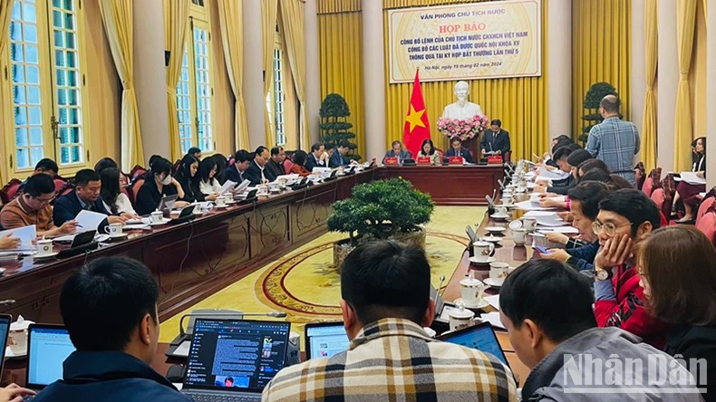 Sáng nay, 19/2, Văn phòng Chủ tịch nước họp báo công bố Lệnh của Chủ tịch nước công bố Luật Đất đai (sửa đổi) và Luật Các tổ chức tín dụng (sửa đổi) được Quốc hội khóa XV thông qua tại kỳ họp bất thường lần thứ 5.