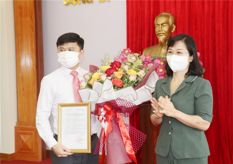 Đồng chí Trịnh Thị Minh Thanh, Ủy viên BTV Tỉnh ủy, Phó Chủ tịch Thường trực HĐND tỉnh trao Quyết định và tặng hoa chúc mừng đồng chí Nguyễn Đức Tiệp nhận nhiệm vụ mới.