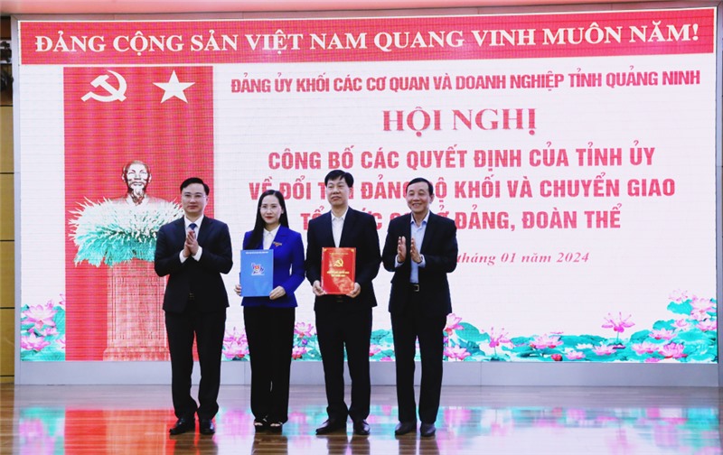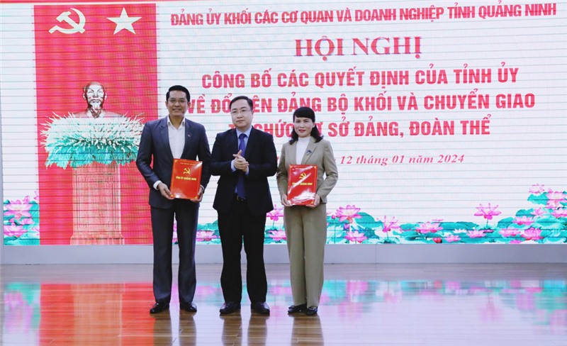 Tại hội nghị, đồng chí Đặng Xuân Phương, Phó Bí thư Tỉnh ủy, Trưởng Đoàn ĐBQH tỉnh đã trao quyết định của Tỉnh ủy về việc đổi tên Đảng bộ Khối các cơ quan và doanh nghiệp tỉnh thành Đảng bộ Khối các cơ quan tỉnh; quyết định về chuyển giao các tổ chức cơ sở Đảng và đảng viên từ Đảng bộ Khối các cơ quan và doanh nghiệp tỉnh về Đảng bộ TP Hạ Long, TP Cẩm Phả; TP Uông Bí và Đảng bộ Than Quảng Ninh.