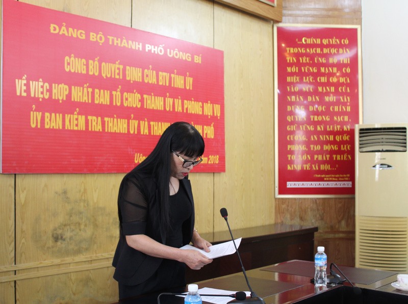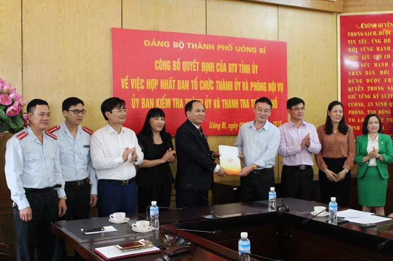 Tại buổi lễ, đồng chí Hoàng Thị Hà, Phó Bí thư Thường trực Thành ủy đã công bố quyết định hợp nhất Ban tổ chức Thành ủy và phòng nội vụ thành phố, quyết định hợp nhất Ủy ban kiểm tra thành ủy với thanh tra thành phố. Theo đó, cơ quan hợp nhất giữa Ban tổ chức Thành ủy và phòng nội vụ sẽ có tên gọi là Cơ quan Tổ chức - Nội vụ thành phố Uông Bí. Cơ quan này có tư cách pháp nhân và sử dụng 2 con dấu của Ban tổ chức cấp ủy và Phòng nội vụ để thực hiện chức năng, nhiệm vụ được giao. Cơ quan hợp nhất giữa ủy ban kiểm tra thành ủy với thanh tra sẽ có tên gọi là Cơ quan Kiểm tra - Thanh tra thành phố Uông Bí. Về biên chế, 2 cơ quan sau khi hợp nhất sẽ sử dụng đội ngũ cán bộ, công chức, người lao động hiện có.