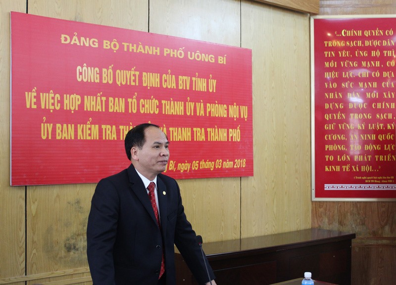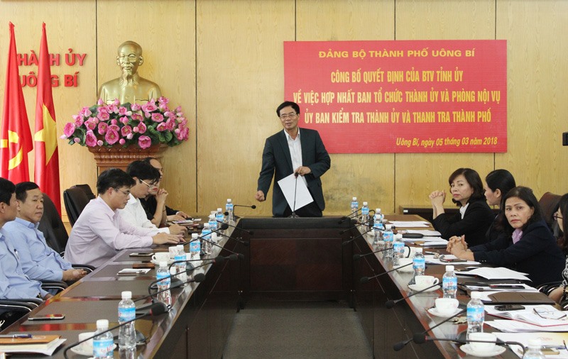 Ngày 5-3, Đảng bộ thành phố Uông Bí tổ chức lễ công bố quyết định hợp nhất Ban tổ chức Thành ủy và phòng Nội vụ; Uỷ ban kiểm tra Thành ủy và Thanh tra thành phố. Dự, chỉ đạo buổi lễ có các đồng chí: Nguyễn Mạnh Tuyên, Phó Chủ nhiệm Ủy ban kiểm tra Tỉnh ủy, lãnh đạo các sở, ban, ngành của tỉnh. Về phía thành phố Uông Bí, dự buổi lễ có các đồng chí: Trần Văn Lâm, Tỉnh ủy viên, Bí thư Thành ủy, Chủ tịch HĐND thành phố; Hoàng Thị Hà, Phó Bí thư Thường trực Thành ủy; Nguyễn Anh Tú, Phó Bí thư Thành ủy, Chủ tịch UBND thành phố; Thường trực Thành ủy; lãnh đạo UBND thành phố; lãnh đạo các phòng, ban, ngành, đơn vị thành phố.