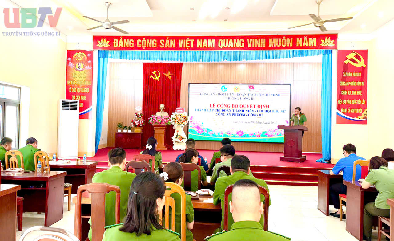 Ngày 04/9, Công an phường Uông Bí phối hợp với Hội Liên hiệp phụ nữ, Đoàn TNCS Hồ Chí Minh phường tổ chức Lễ công bố Quyết định thành lập Chi đoàn Thanh niên và Chi hội Phụ nữ Công an phường. Dự và chúc mừng có đồng chí Nguyễn Hồng Quang, Ủy viên Ban Thường vụ Đảng ủy, Chủ tịch Ủy ban MTTQ phường; cán bộ Ban công tác Hội Phụ nữ tỉnh; lãnh đạo Hội Phụ nữ, Thanh niên, Công an phường.