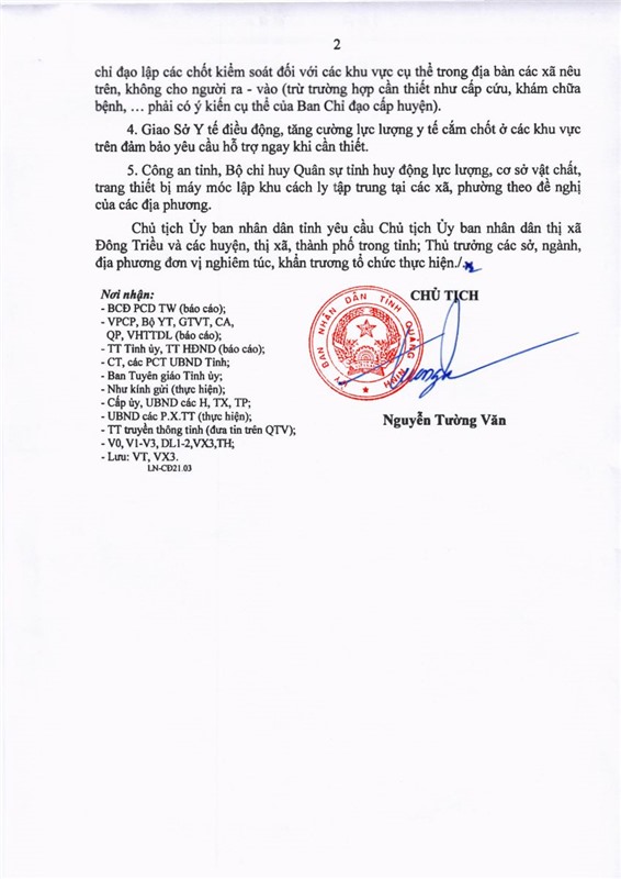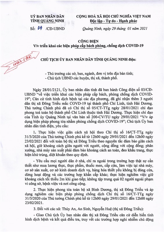 Hôm nay, đồng chí Chủ tịch UBND tỉnh ban hành Công điện về việc triển khai các biện pháp cấp bách phòng, chống dịch Covid-19.