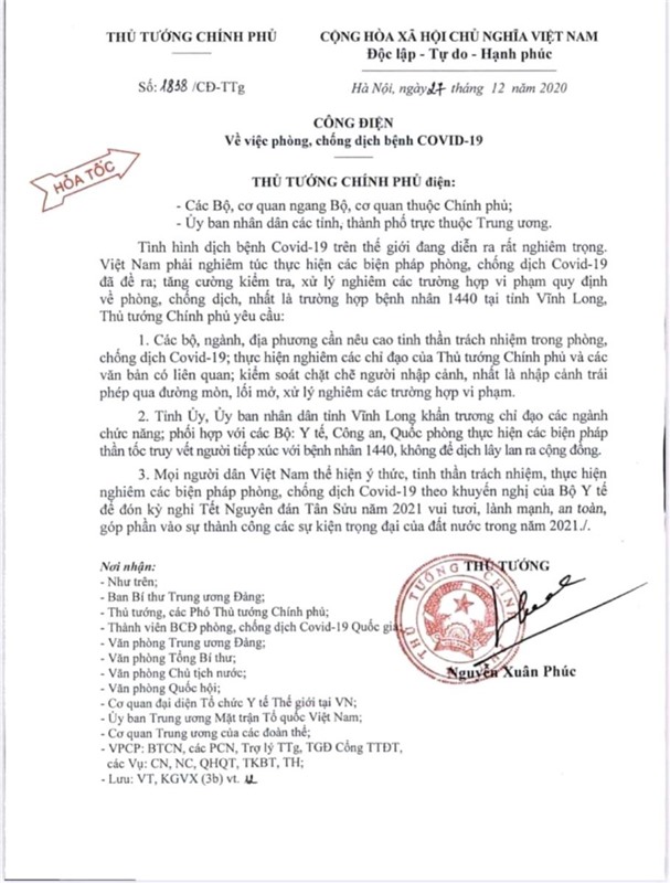 Thủ tướng Chính phủ Nguyễn Xuân Phúc vừa ký ban hành Công điện 1838/CĐ-TTg về việc phòng, chống dịch bệnh COVID-19, trong đó yêu cầu thần tốc truy vết người tiếp xúc với bệnh nhân 1440, kiểm soát chặt người nhập cảnh, không để dịch lây lan ra cộng đồng.