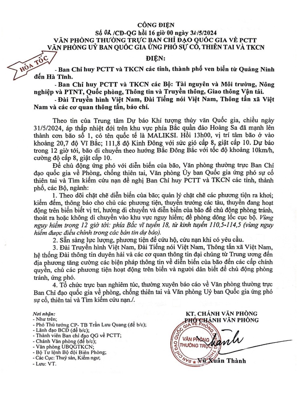 Công điện của Văn phòng Thường trực Ban chỉ đạo Quốc gia về PCTT, Văn phòng Uỷ ban Quốc gia ứng phó sự cố, thiên tai và TKCN