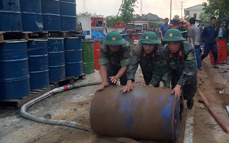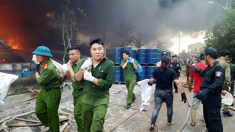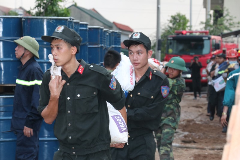 Bất chấp tay không, các chiến sĩ bộ đội khẩn trương vận chuyển các thùng tạo bọt để chữa cháy.