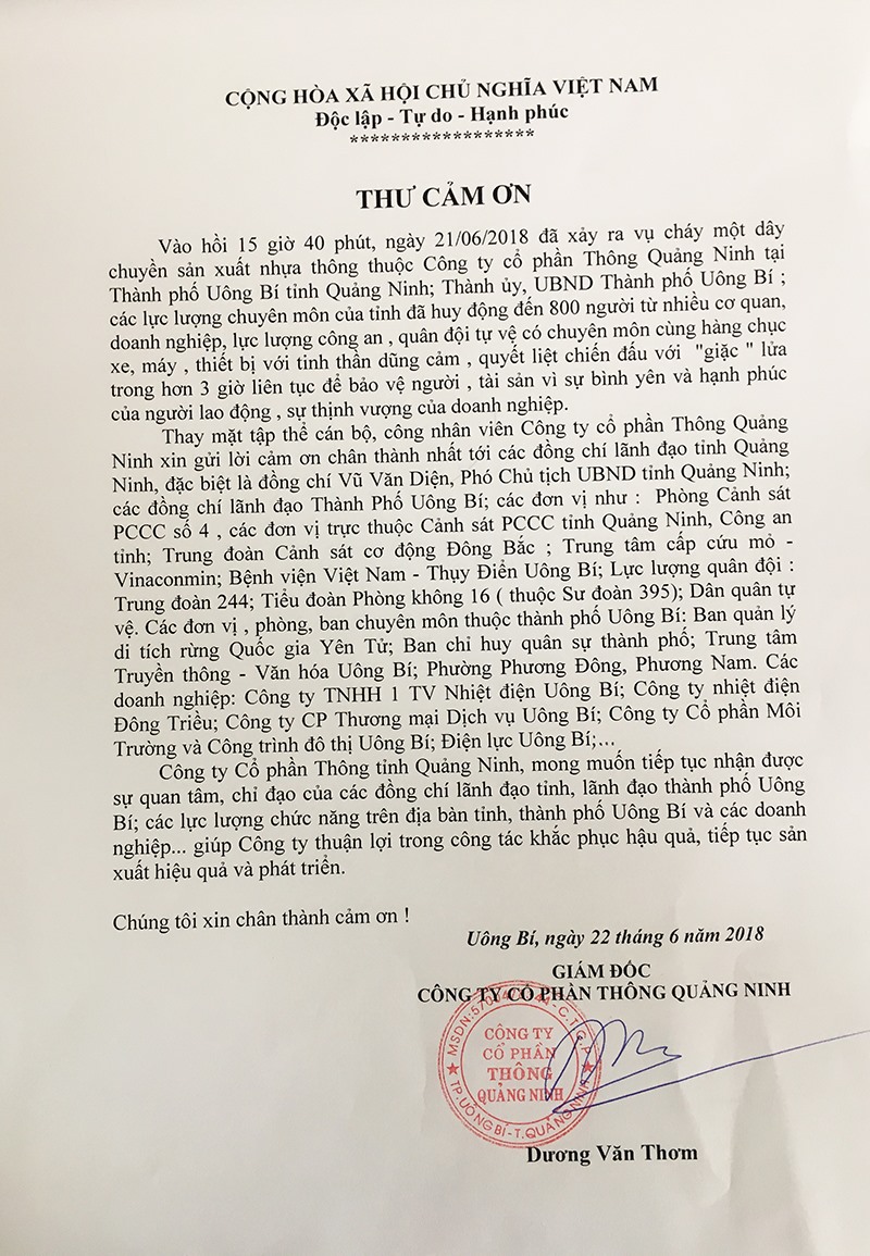 Ngày 23/6, Công ty CP Thông Quảng Ninh đã gửi thư cảm ơn các đồng chí lãnh đạo tỉnh, TP Uông Bí; các lực lượng chuyên môn của tỉnh, thành phố Uông Bí và các doanh nghiệp đã mưu trí, dũng cảm, quyết liệt chữa cháy trong vụ cháy dây chuyền sản xuất nhựa thông ngày 21/6, kịp thời bảo vệ tài sản cho Công ty.