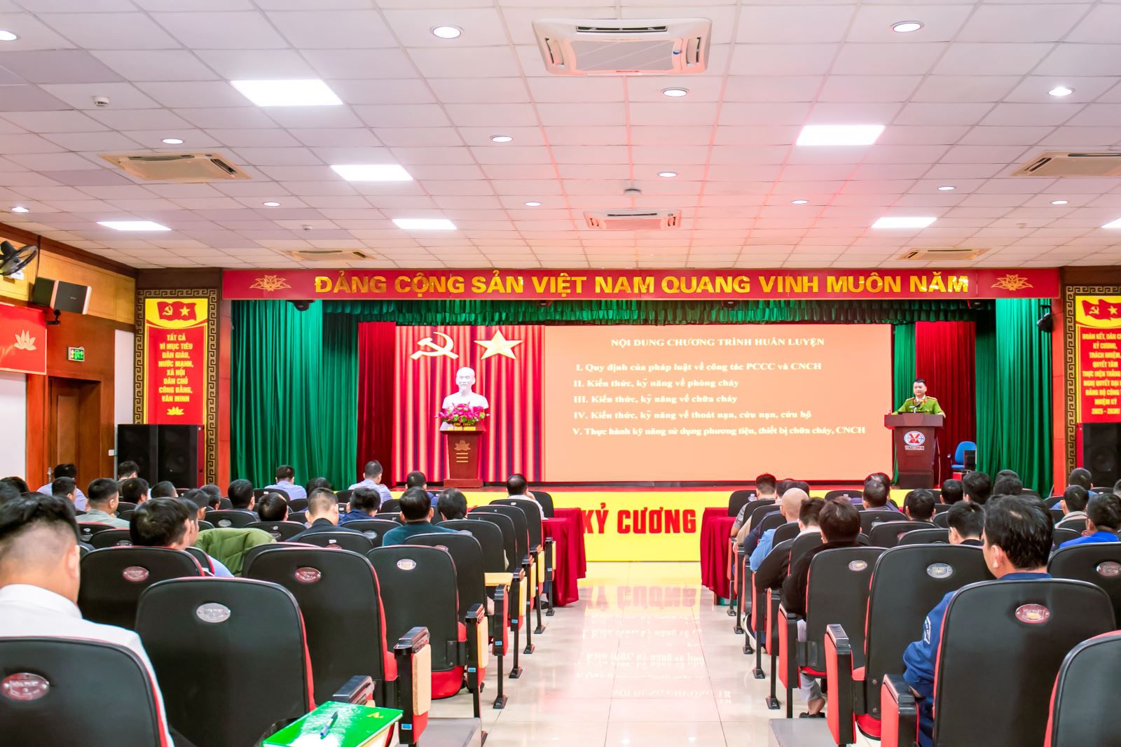 Tham dự lớp huấn luyện bồi dưỡng nghiệp vụ, kiến thức về PCCC - CNCH gồm 245 đồng chí là Giám đốc, Phó Giám đốc Công ty, Trưởng phòng, Phó phòng, Quản đốc, Đội trưởng và các đội viên lực lượng chữa cháy tại các đơn vị.