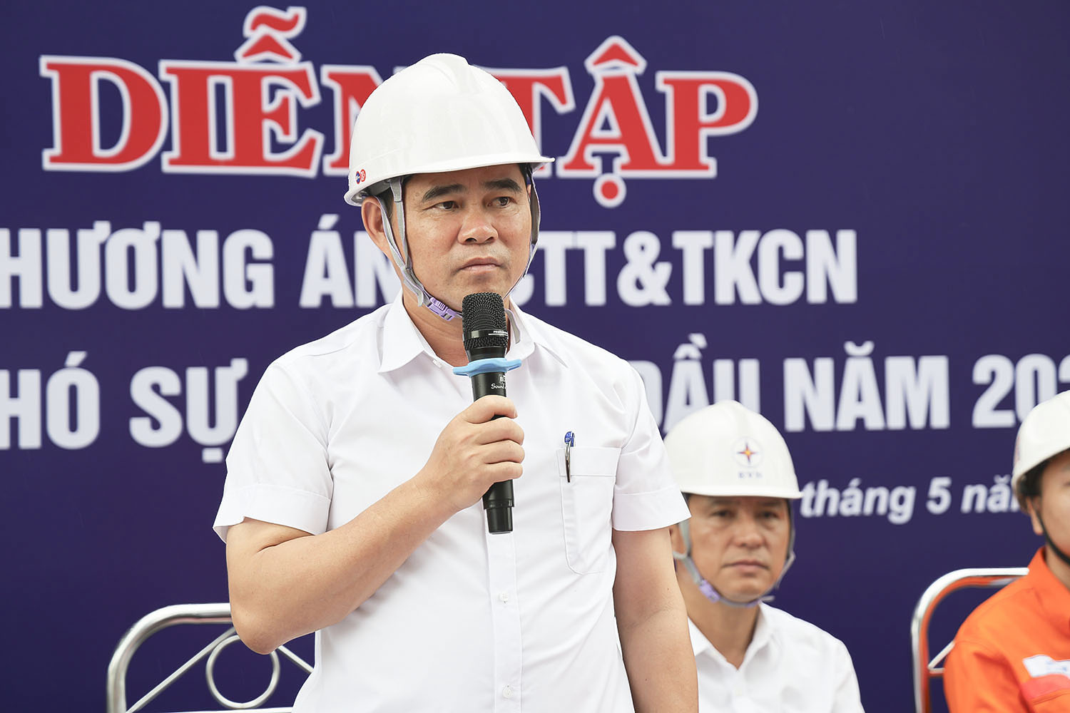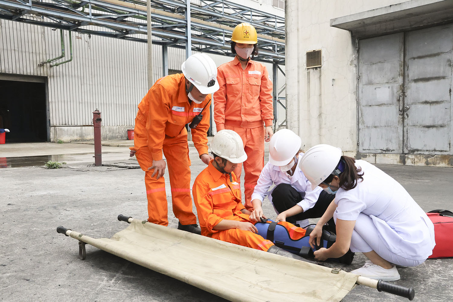 Trong khi xử lý sự cố có nhân viên trượt vấp ngã cầu thang, bị thương trong trạm bơm (tình huống giả định). Đội trưởng đội xung kích PCTT&TKCN Công ty gọi nhân viên y tế và xe cứu thương; các lực lượng nhanh chóng đưa nạn nhân ra khỏi trạm bơm, phối hợp sơ cứu, giao cho nhân viên Y tế cấp cứu.