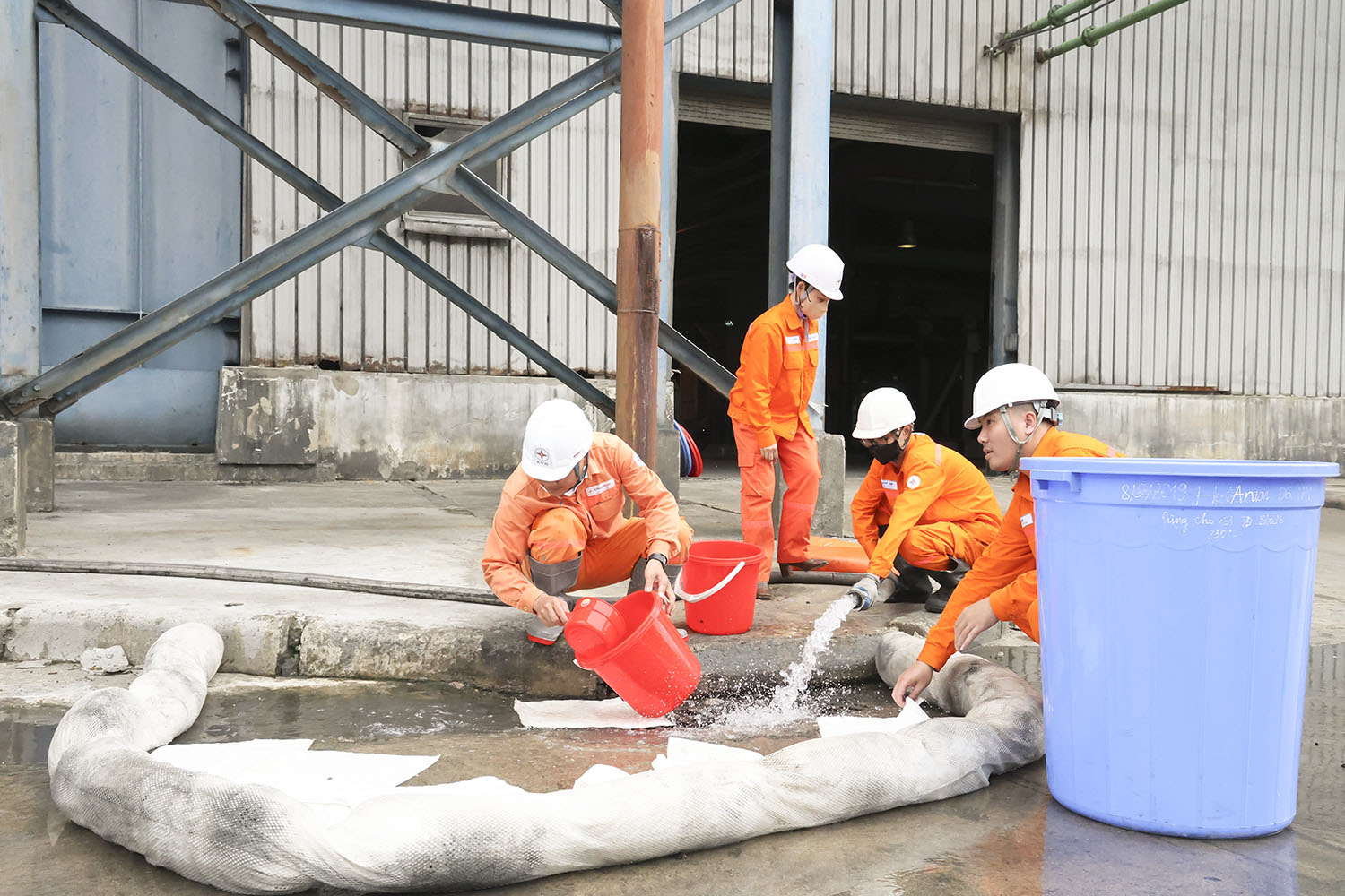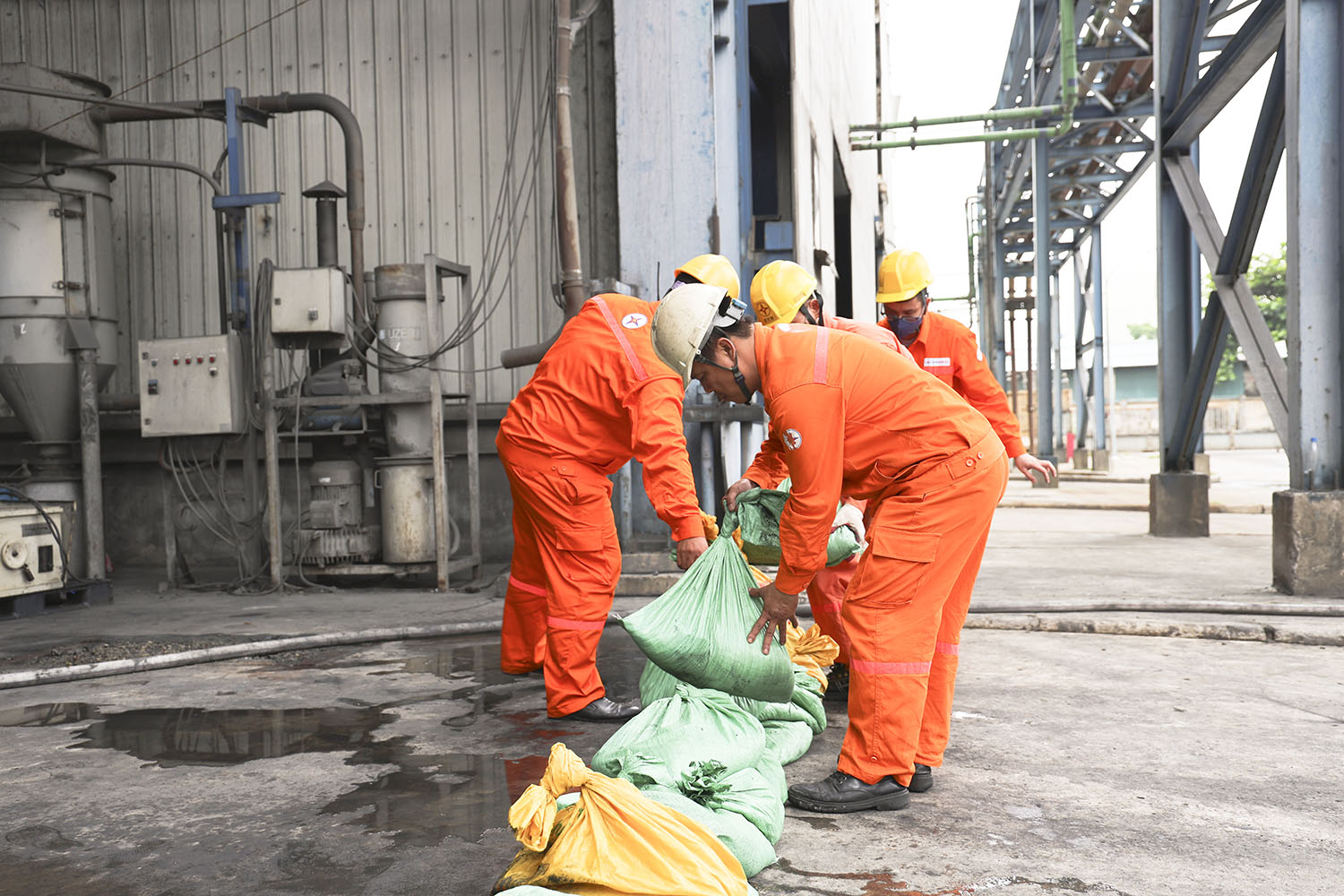 Ngay khi tiếp nhận thông tin, Trưởng Ban Chỉ huy PCTT&TKCN Công ty đã uỷ quyền cho Trưởng kíp thực hiện chỉ huy, điều động Đội xung kích PCTT&TKCN khẩn trương triển khai chiến thuật xử lý sự cố. Theo chỉ đạo, công nhân vận hành dựa vào trang thiết bị sẵn có, khắc phục nhanh lỗi để giảm mức độ ngập nước; phối hợp cùng Đội xung kích và các đơn vị trong Công ty sử dụng trang thiết bị xử lý, dùng bao cát và quây phao chặn nước tràn vào trạm dầu, khắc phục nhanh lỗi để giảm mức độ ngập nước. Đồng thời kết hợp sử dụng các bơm nước di động chuyển nước có lẫn dầu về khu xử lý nước.