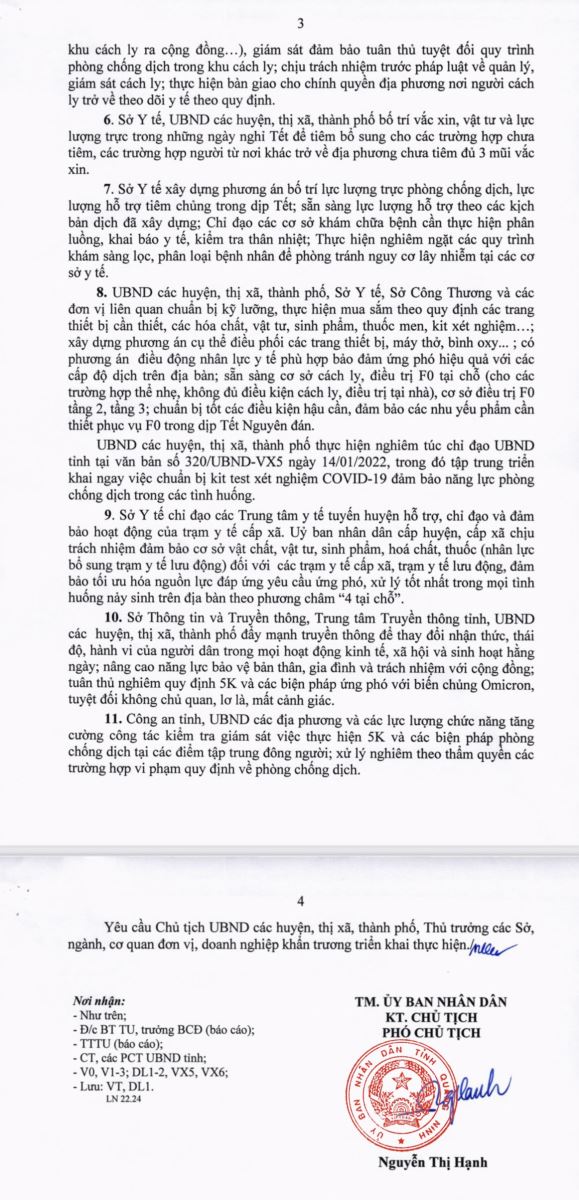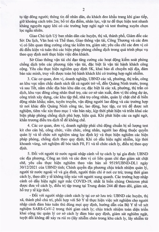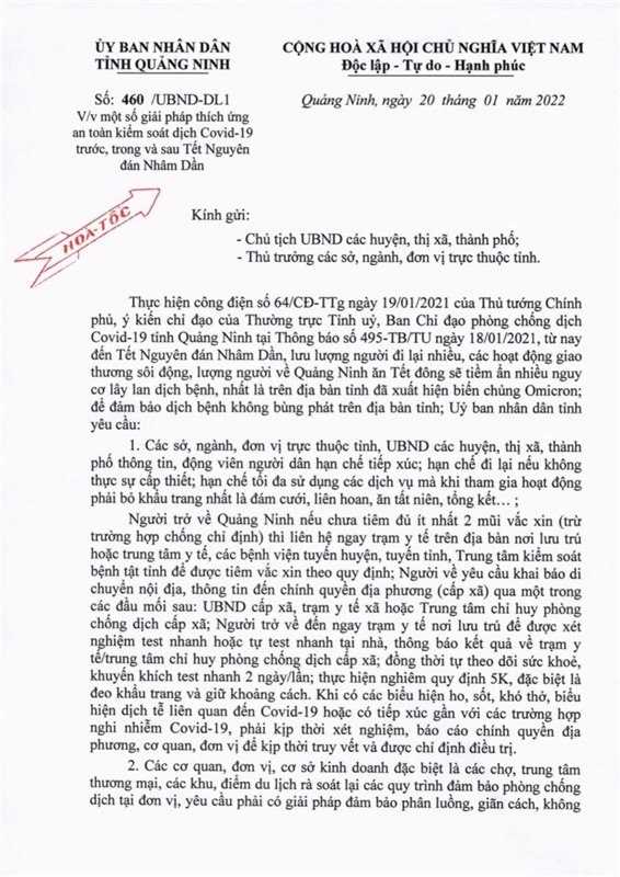 Công văn của UBND tỉnh Quảng Ninh về một số giải pháp thích ứng an toàn kiểm soát dịch Covid-19 trước, trong và sau Tết Nguyên đán Nhâm Dần