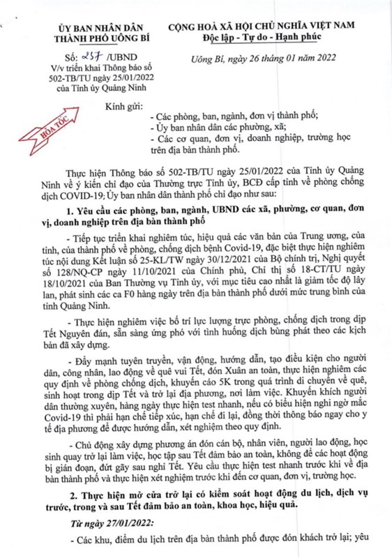 Công văn của UBND TP Uông Bí về việc triển khai Thông báo số 502-TB/TU ngày 25/01/2022 của Tỉnh uỷ Quảng Ninh