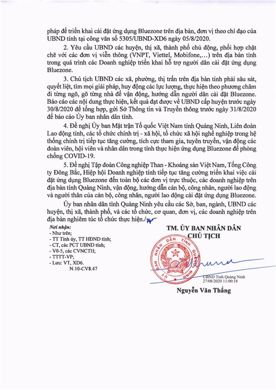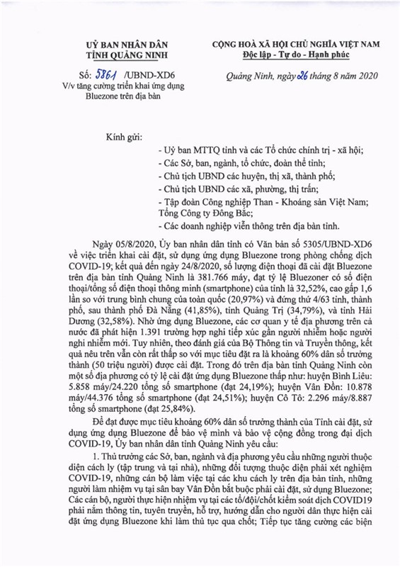 Công văn số 5861/UBND-XD6 ngày 26/8/2020 của UBND tỉnh V/v tăng cường triển khai ứng dụng Bluezone trên địa bàn: