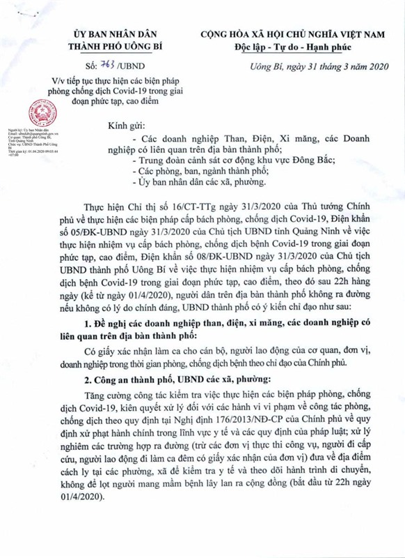 Công văn số 763/UBND ngày 31/3/2020 của Ủy ban nhân dân Thành phố Uông Bí: V/v tiếp tục thực hiện các biện pháp phòng, chống dịch Covid-19 trong giai đoạn phức tạp, cao điểm