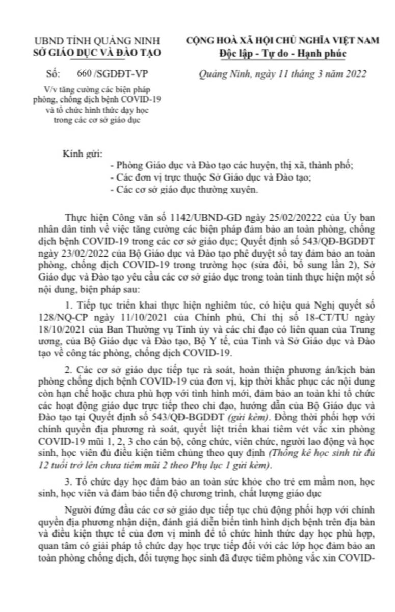 Công văn về việc tăng cường các biện pháp phòng, chống dịch bệnh COVID-19 và tổ chức hình thức dạy học trong các cơ sở giáo dục