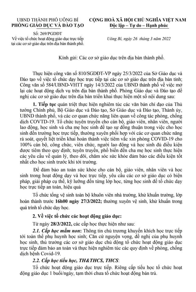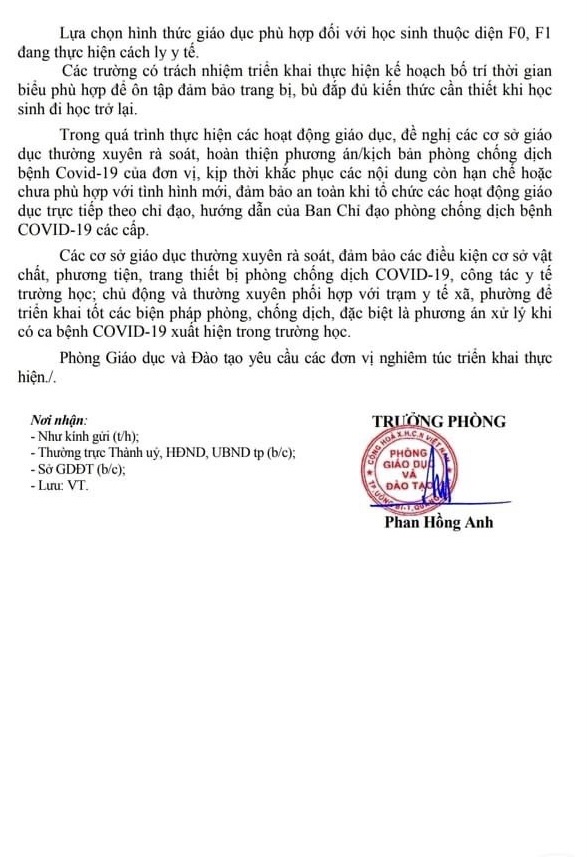 Công văn về việc tổ chức hoạt động giáo dục trực tiếp tại các cơ sở giáo dục trên địa bàn thành phố