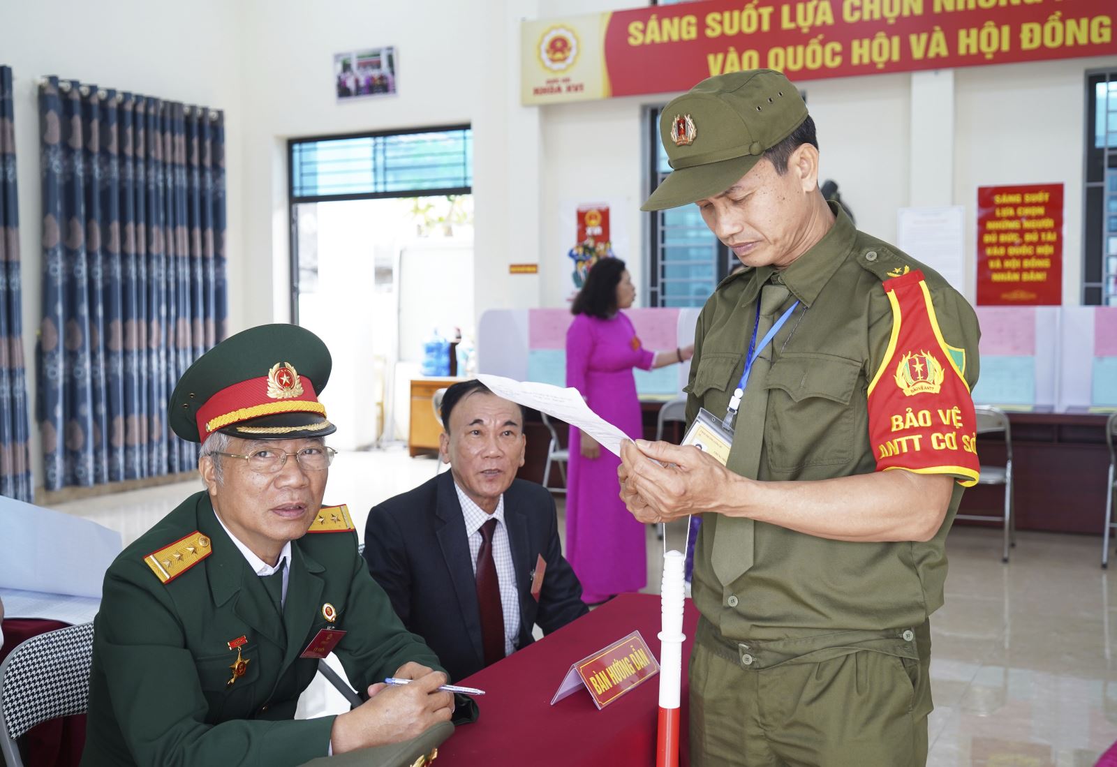 Lực lượng bảo vệ an ninh trật tự cơ sở và các thành viên tổ bầu cử tập trung cao độ, đảm bảo mọi khâu trong quy trình bỏ phiếu diễn ra an toàn, đúng quy định pháp luật.