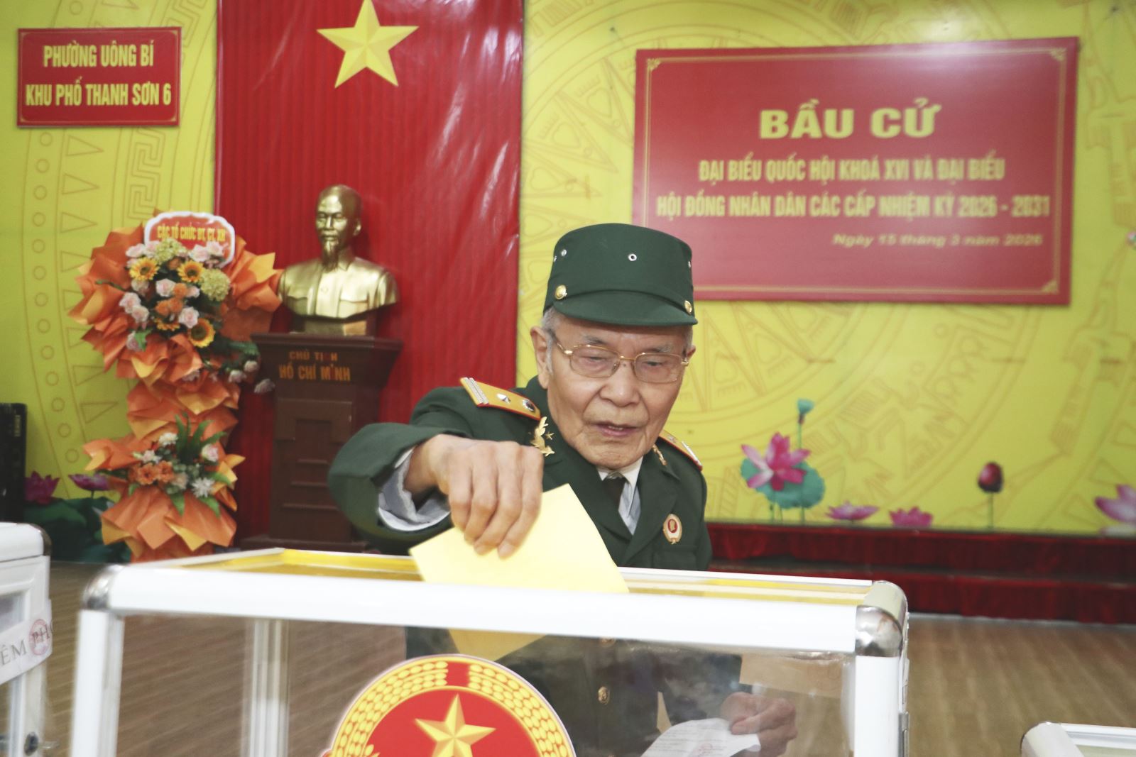 Cử tri là cựu chiến binh chỉnh tề trong quân phục, nghiêm túc thực hiện nghĩa vụ công dân, tiếp tục đóng góp cho sự nghiệp xây dựng đất nước.