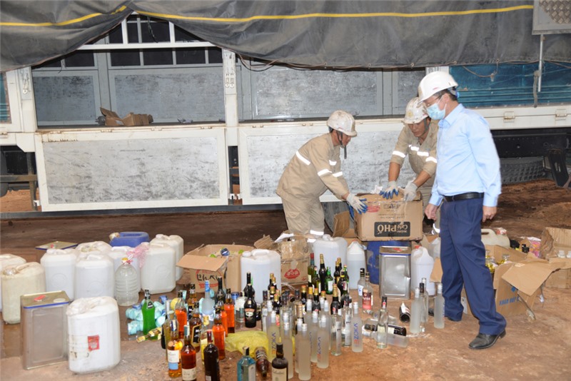 Lực lượng chức năng tiêu hủy khoảng 250 chai rượu bia nhập lậu, không đảm bảo nguồn gốc, xuất xứ.