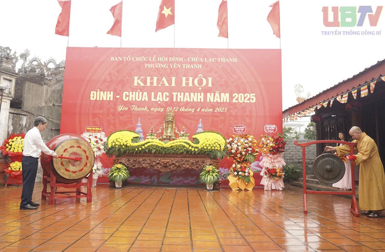 Lãnh đạo địa phương và Trụ trì Chùa Lạc Thanh gióng trống, thỉnh chiêng khai hội.