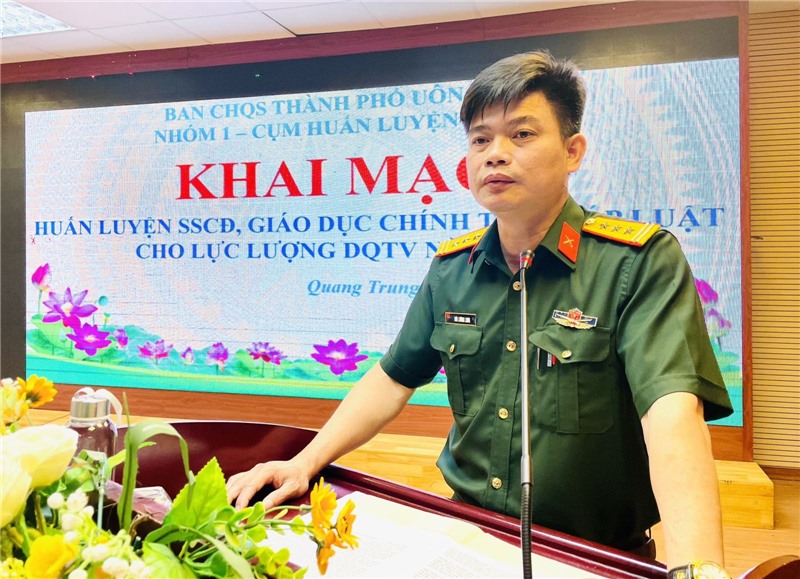 Lãnh đạo phường Quang Trung - Cụm trưởng Cụm huấn luyện số 2 phát biểu trong chương trình khai mạc.