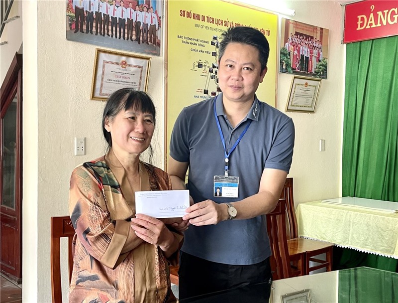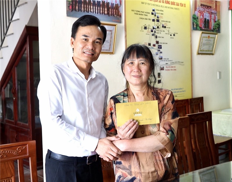 Ban Quản lý di tích và Rừng Quốc gia Yên Tử, Công ty cổ phần phát triển Tùng Lâm, xã Thượng Yên Công tặng quà động viên bà Nguyễn Thị Bích Liên sau khi bà được cứu hộ an toàn.