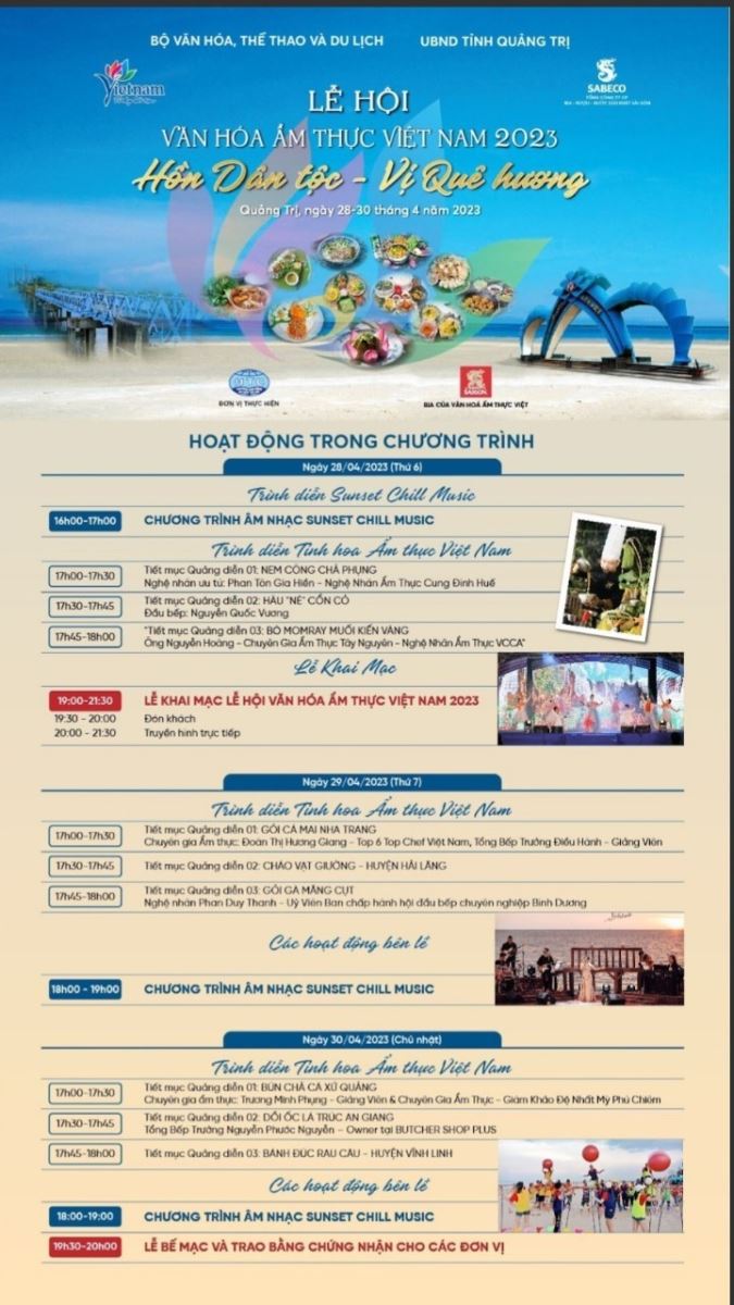 Lễ hội Văn hóa-ẩm thực Việt Nam 2023, được tổ chức Theo Kế hoạch số 980/KH-BVHTTDL được ban hành ngày 17/3/2023 của Bộ Văn hóa, Thể thao và Du lịch, sẽ diễn ra từ 28-30/4 tại Quảng trường Khu dịch vụ du lịch Cửa Việt, thị trấn Cửa Việt, huyện Gio Linh, tỉnh Quảng Trị.