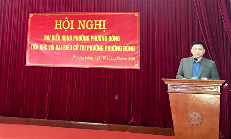 Đồng chí Mai Văn Dự, Chủ tịch UBND phường Phương Đông báo cáo kết quả giải quyết ý kiến, kiến nghị của cử tri.