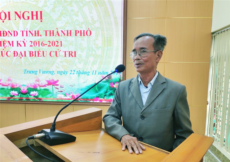 Cử tri phát biểu ý kiến tại buổi tiếp xúc.