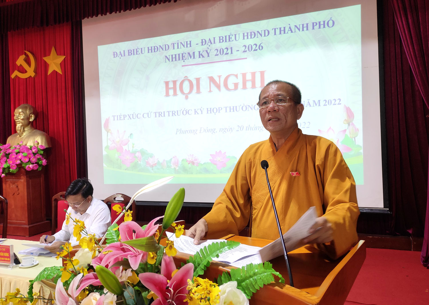 Thượng tọa Thích Đạo Hiển, Uỷ viên Hội đồng Trị sự Trung ương giáo hội Phật giáo Việt Nam - Phó Trưởng ban Giáo dục Phật giáo Trung ương, Phó Trưởng ban kiêm chánh thư ký Ban trị sự Giáo hội Phật giáo Việt Nam tỉnh Quảng Ninh, đại diện đại biểu HĐND tỉnh ứng cử trên địa bàn thành phố tiếp xúc cử tri phường Phương Đông.