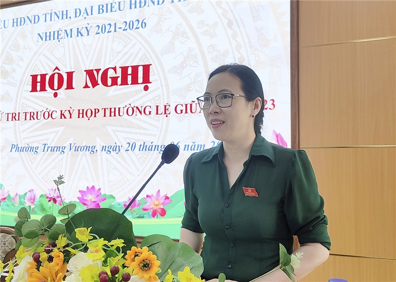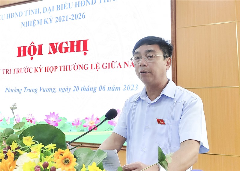 Thay mặt tổ đại biểu HĐND tỉnh và thành phố, đồng chí Nghiêm Xuân Cường, Tỉnh ủy viên, Bí thư Thành ủy, Chủ tịch HĐND thành phố báo cáo nhanh tới đại biểu cử tri phường Trưng Vương kết quả thực hiện nhiệm vụ phát triển kinh tế - xã hội trên địa bàn tỉnh và thành phố 6 tháng đầu năm.
