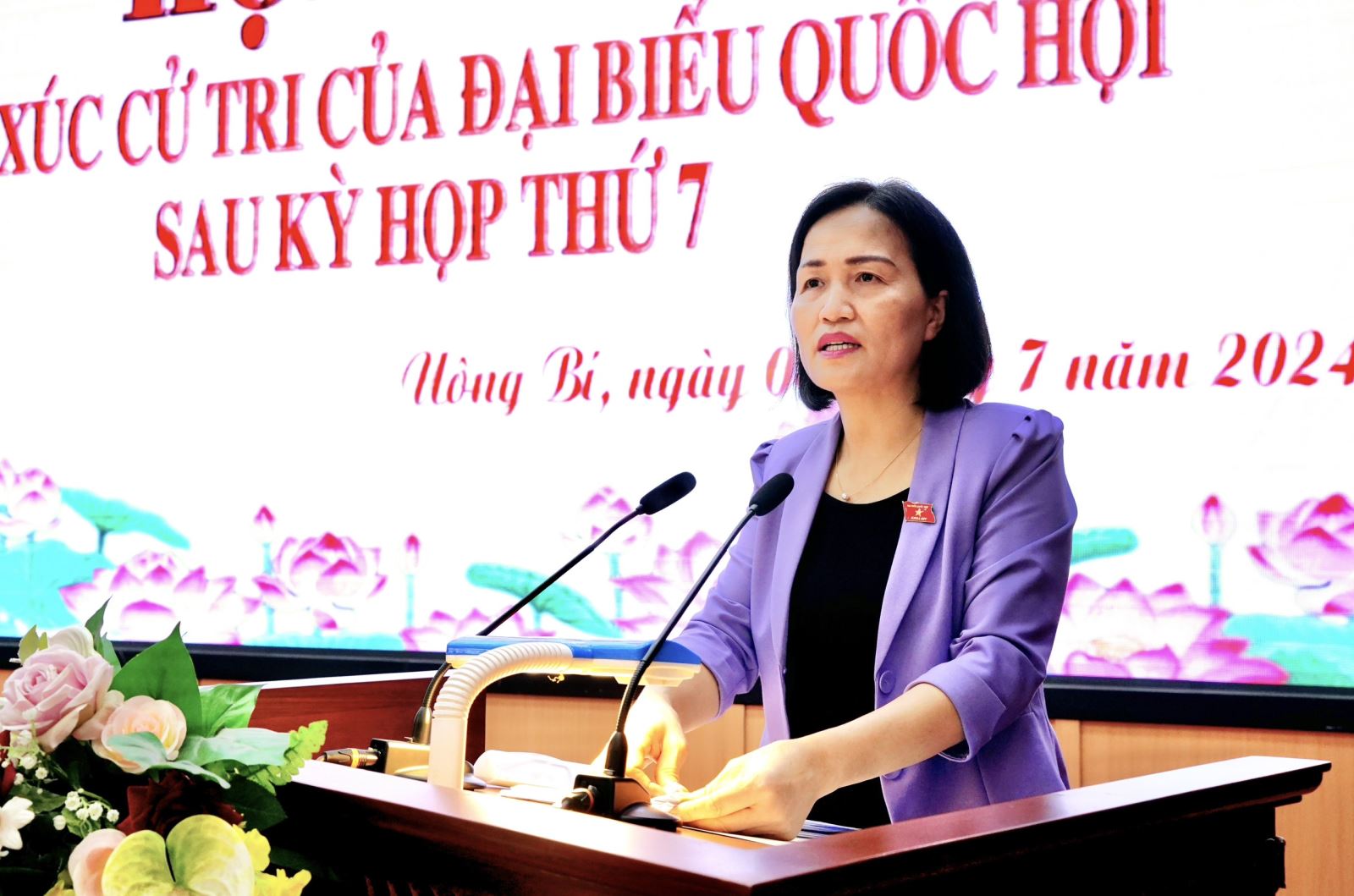 Tại buổi tiếp xúc, Đại biểu Quốc hội Trần Thị Kim Nhung đã báo cáo kết quả Kỳ họp thứ 7, Quốc hội khóa XV. Theo đó, sau 27,5 ngày làm việc, Kỳ họp đã hoàn thành toàn bộ chương trình đề ra. Quốc hội đã xem xét, biểu quyết thông qua 11 Luật, 21 Nghị quyết; cho ý kiến đối với 9 Dự án luật và các báo cáo quan trọng về phát triển kinh tế - xã hội của đất nước. Việc thông qua, cho ý kiến đối với các Dự án luật, Nghị quyết được Quốc hội thống nhất cao, bảo đảm chất lượng từ công tác chuẩn bị, tiếp thu, giải trình, hoàn thiện và thông qua.