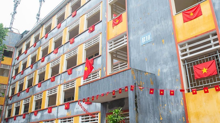 Không khí chào mừng Quốc khánh 2/9 với sắc cờ đỏ sao vàng bên ngoài khu ký túc xá.