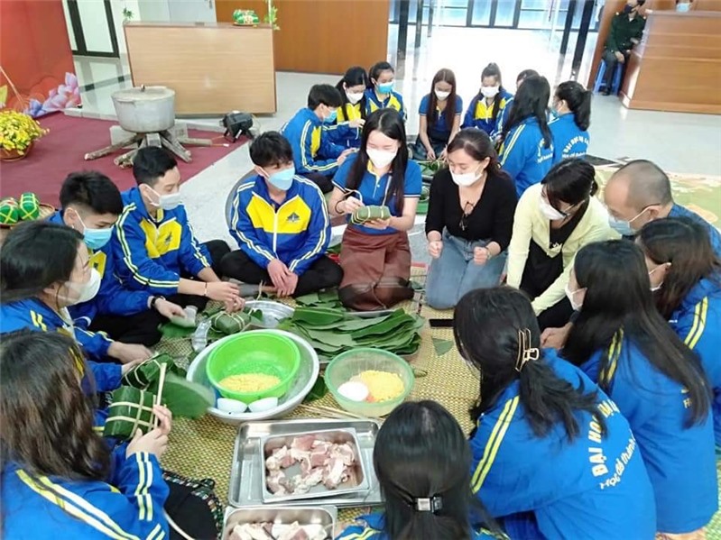 Sinh viên Trường Đại học Hạ Long thực hành tìm hiểu văn hóa ẩm thực thông qua hoạt động gói bánh chưng ngày Tết.