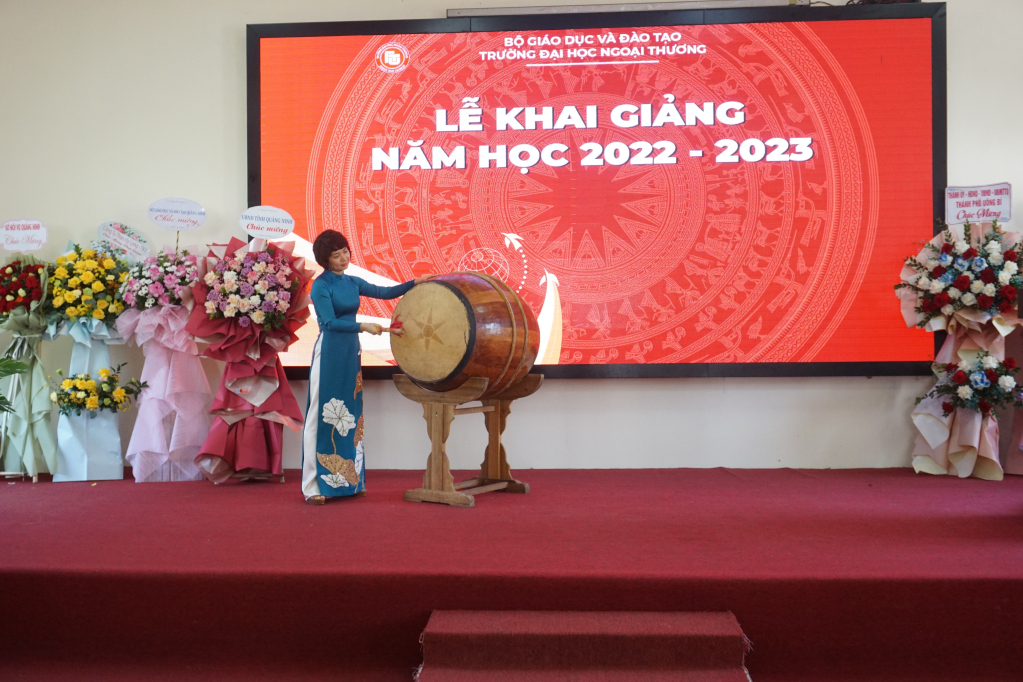 PGS, TS Phạm Thu Hương, Phó Hiệu trưởng Trường Đại học Ngoại thương gióng trống khai giảng năm học 2022-2023 tại cơ sở Quảng Ninh.