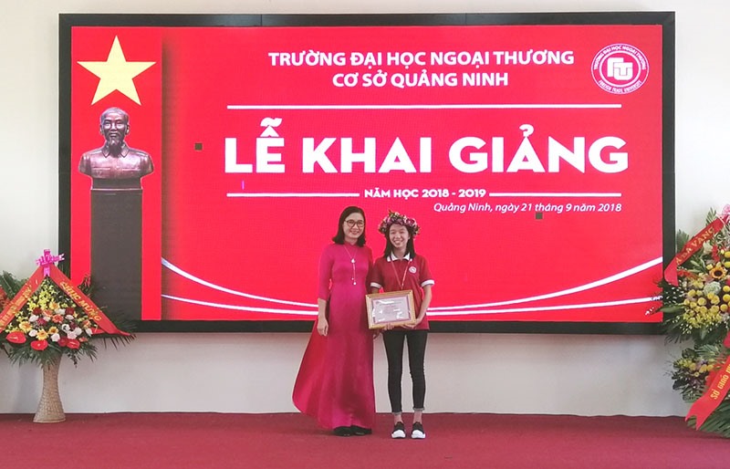 Lãnh đạo nhà trường trao bằng khen và phần thưởng cho thủ khoa đầu vào khóa 57, Đại học Ngoại thương cơ sở Quảng Ninh.
