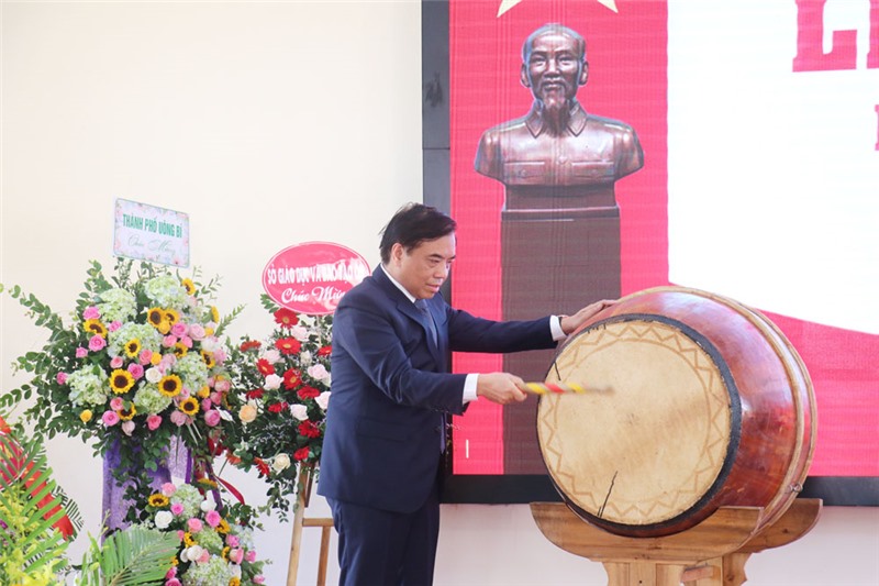 Chủ tịch UBND TP Uông Bí Nguyễn Mạnh Hà tặng hoa chúc mừng Nhà trường.