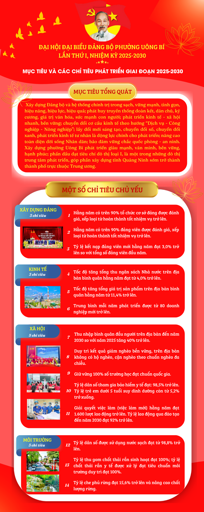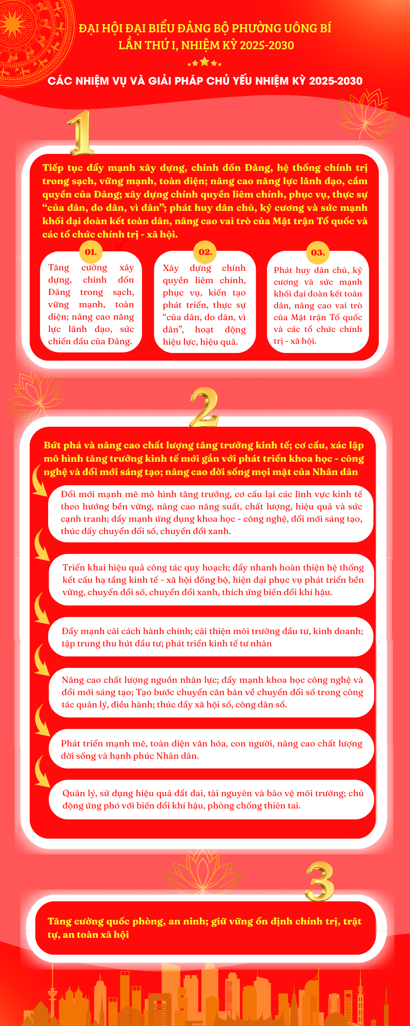 ĐẠI HỘI ĐẠI BIỂU ĐẢNG BỘ PHƯỜNG UÔNG BÍ LẦN THỨ I, NHIỆM KỲ 2025-2030: MỤC TIÊU TỔNG QUÁT VÀ CÁC CHỈ TIÊU PHÁT TRIỂN GIAI ĐOẠN 2025-2030; CÁC NHIỆM VỤ VÀ GIẢI PHÁP CHỦ YẾU NHIỆM KỲ 2025-2030
