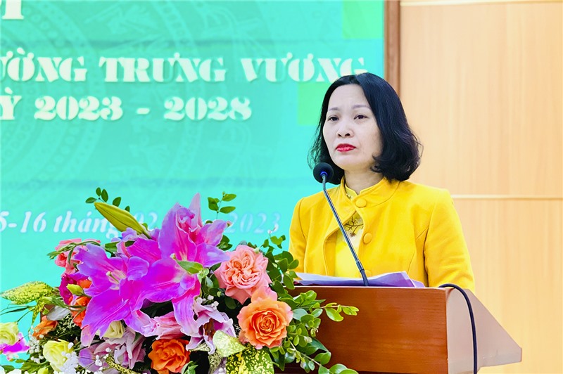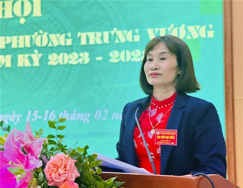 Đồng chí Phạm Thị Băng, Chủ tịch Hội Nông dân phường Trưng Vương báo cáo kết quả thực hiện nhiệm vụ công tác hội và phong trào Nông dân nhiệm kỳ 2018-2023.