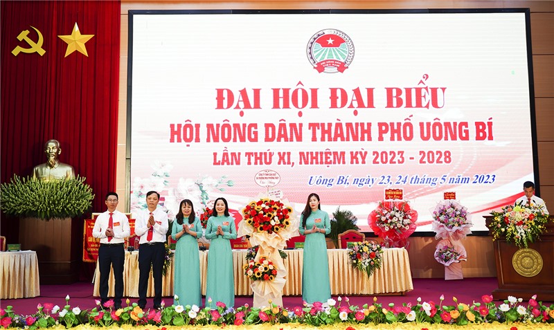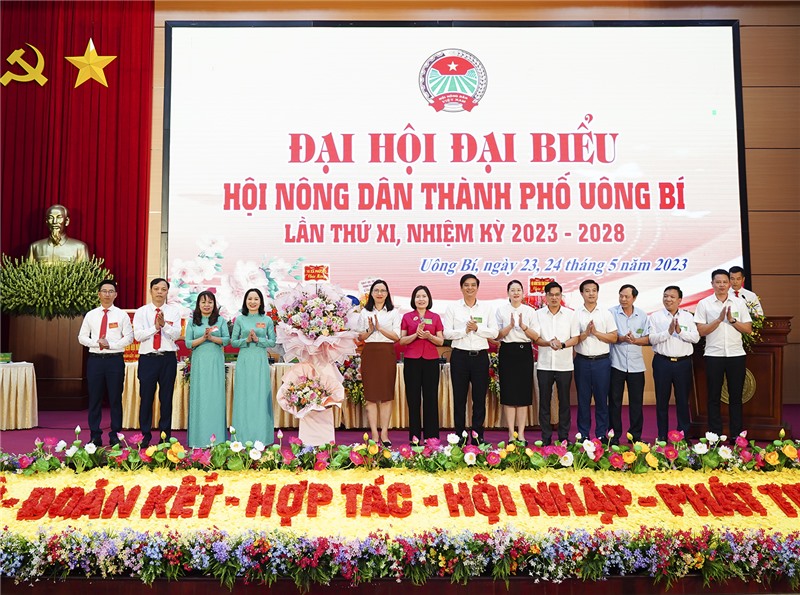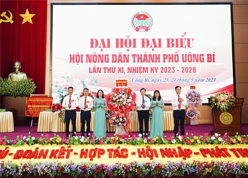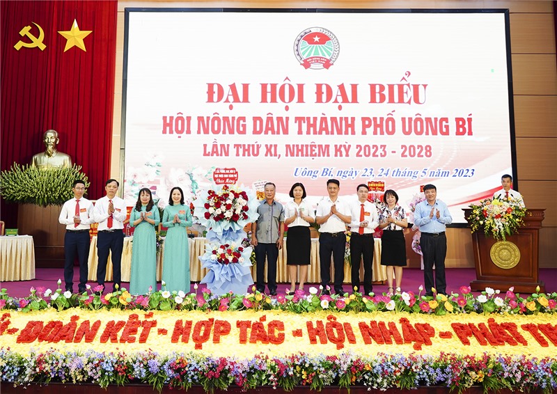 Lãnh đạo thành phố tặng hoa chúc mừng Đại hội. Nhân Đại hội đại biểu Hội Nông dân thành phố Uông Bí lần thứ XI, nhiệm kỳ 2023 - 2028, Thành uỷ, HĐND, UBND, Uỷ ban MTTQ thành phố Uông Bí tặng cán bộ, hội viên Hội Nông dân thành phố Uông Bí bức trướng mang dòng chữ "Dân chủ - Đoàn kết - Hợp tác - Hội nhập - phát triển" xây dựng phong trào nông dân và tổ chức hội vững mạnh.