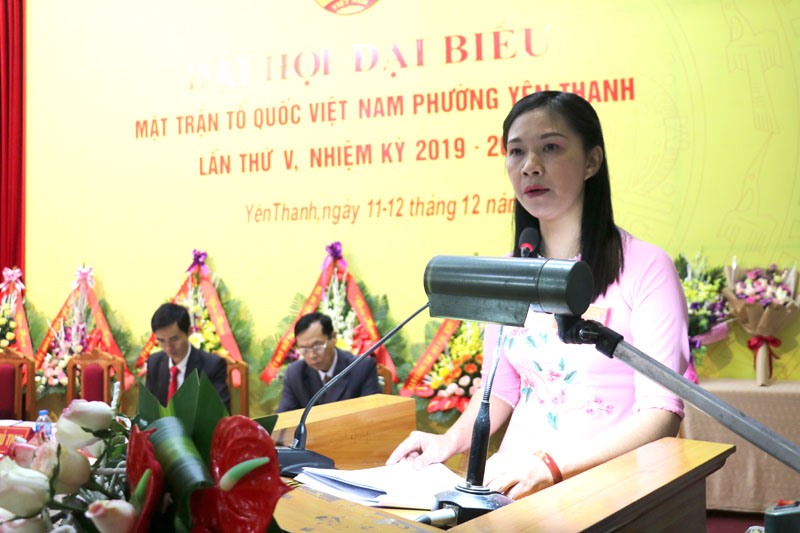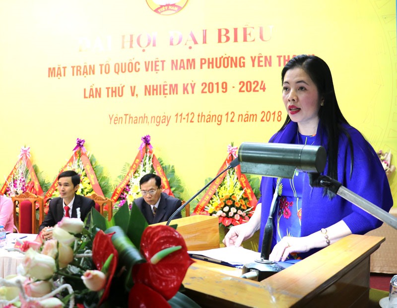 Đồng chí Nguyễn Thị Thanh Nga, Chủ tịch UB MTTQ phường Yên Thanh phát biểu tại Đại hội.